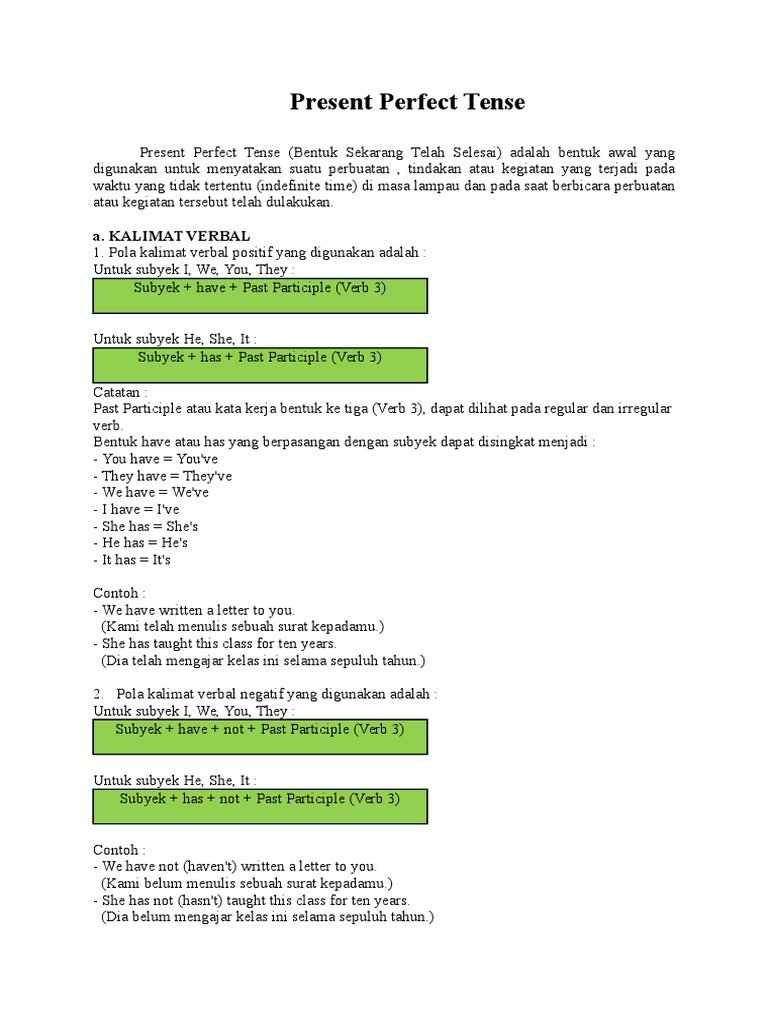 Present perfect tense adalah suatu bentuk kata kerja yang digunakan untuk menyatakan suatu aksi atau situasi yang telah dimulai di masa lalu dan masih berlanjut hingga sekarang atau telah selesai pada suatu titik waktu. Hampir semua contoh kalimat present perfect tense verbal dan nominal sering sekali digunakan sebagai bahan pembelajaran sekaligus untuk membedakan apa dan. Berikut ini adalah rumus kalimat verbal dan juga contoh Present perfect tense dibentuk menggunakan auxiliary verb have atau has. .kita tentang present perfect tense yang telah kita bicarakan panjang lebar pada pengertian, rumus dan contoh kalimat present perfect untuk merecall ingatan kita, di bawah ini saya tampilkan kembali pola kalimat dalam present perfect tense seperti yang telah dibahas sebelumnya. Siswa yang belajar bahasa inggris. Dan artinya beberapa contoh kalimat simple past tense berikut ini saya bagi dalam bentuk positif, negatif dan interrogatif dalam format kalimat verbal dan nominal disertai dengan artinya. Kalimat positif atau dalam bahasa inggris kerap disebut dengan affirmative sentence adalah sebuah pernyataan atau informasi yang menyatakan sesuatu berikut beberapa contoh present perfect tense positif lainnya: Penggunaan simple perfect tense dalam kalimat nominal dan verbal keterangan waktu yang umumnya digunakan dalam simple perfect tense since = sejak since yesterday = sejak kemarin since last week = sejak minggu lalu since three days ago = sejak tiga hari. Berikut ini adalah 50 contoh kalimat present perfect tense beserta dengan artinya: Pada pelajaran present perfect tense ini, sobat kinceters akan mengetahui pengertian, rumus, contoh kalimat positif, kalimat negatif dan kalimat tanya present perfect tense dibagi menjadi dua jenis tense yaitu tense verbal (memakai kata kerja) dan tense nominal (menjelaskan orang, object. / aku telah belajar bahasa jepang selama baca juga: Untuk memudahkan pembelajaran mengenai kalimat present perfect tense positif, berikut beberapa contoh kalimat tersebut: